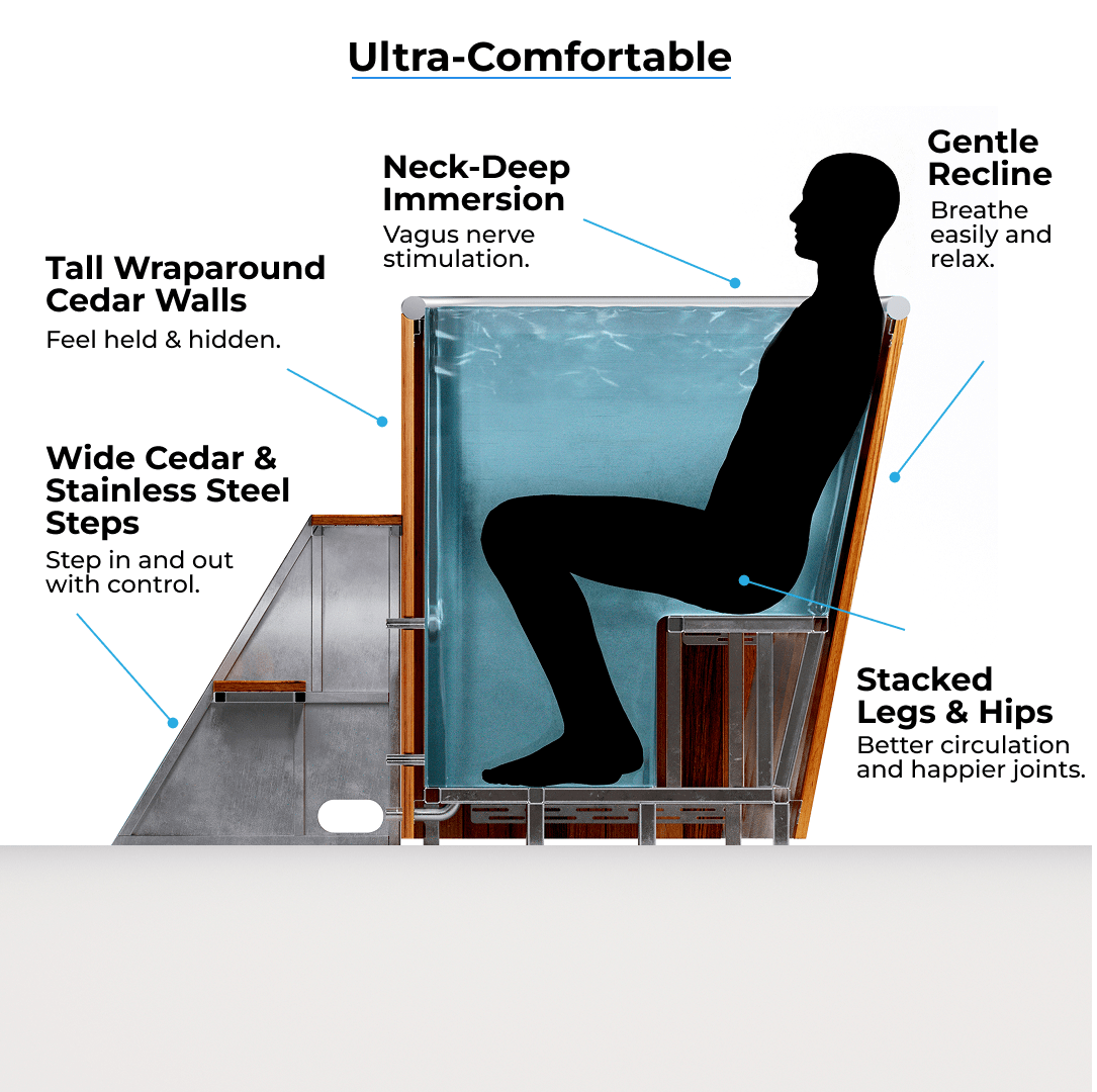 The only cedar vertical-hybrid cold plunge engineered for full-body immersion and spa-level comfort, with an integrated reclining seat.