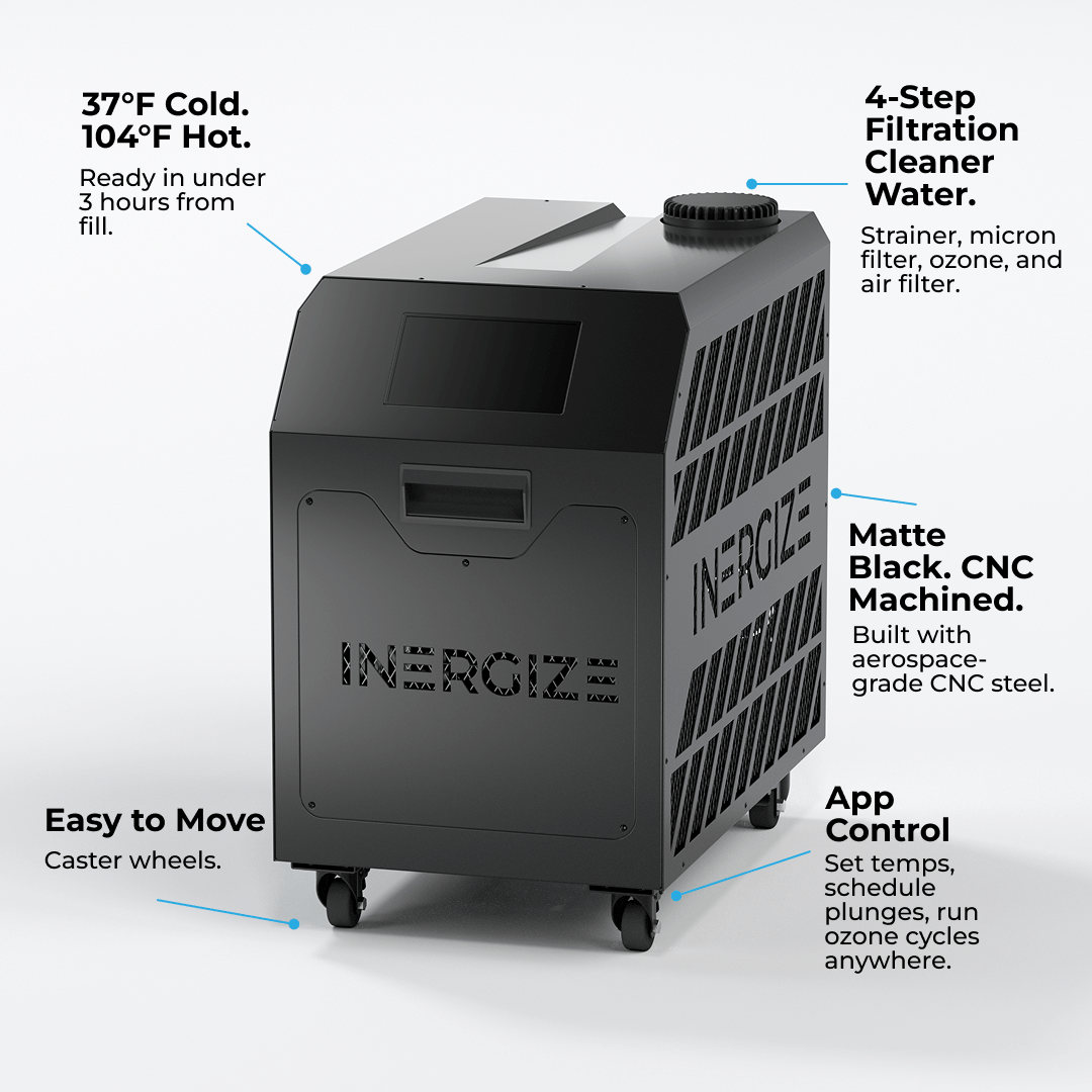 - Inergize Chiller: Cools water down or heats with local controls and app, continuous ozone and filtration.